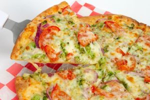 Thin crust, three-cheese blend, red onion, Roma tomatoes and broccoli swirl of white ...